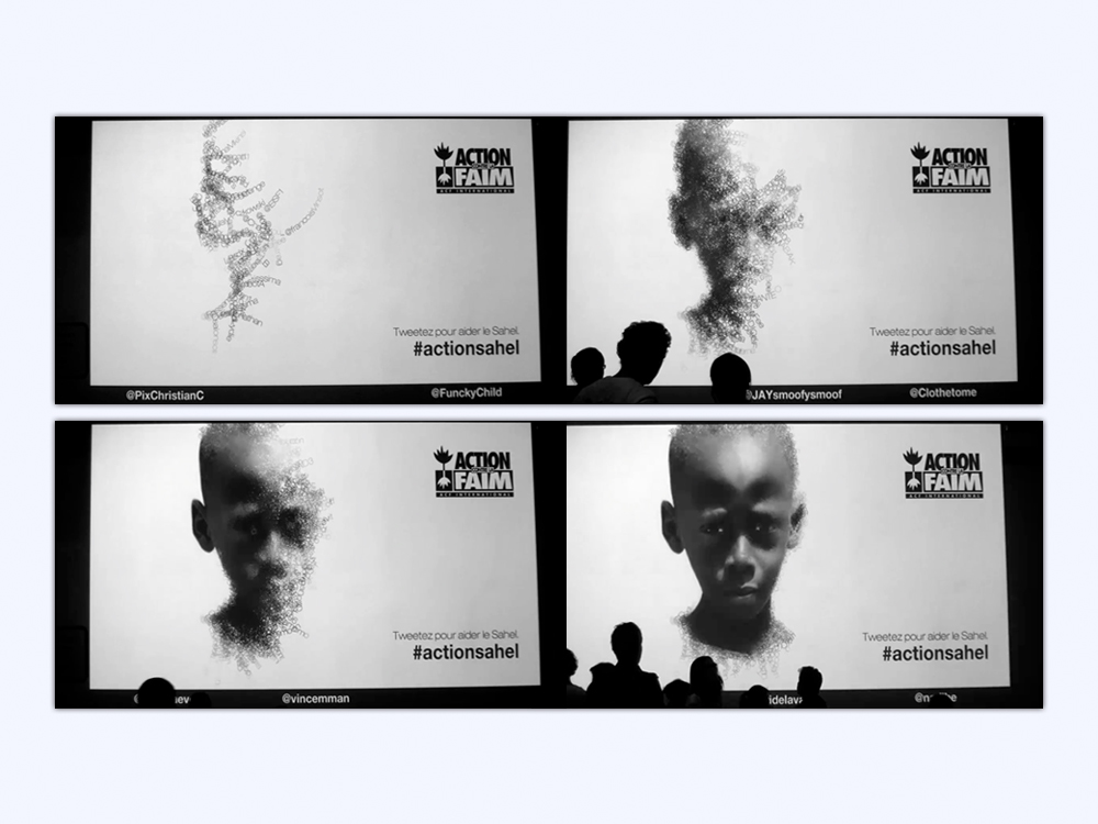 The end of the campaign asked twitter user to tweet while using the #actionsahel during the European night of the Culture. All the tweets were tracked, and, all together they formed the child face present on all the adverts.